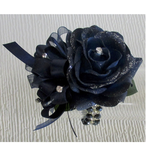 Navy & Ivory Rose Wrist Corsage with Pear Leaf Detail and Diamante & Pearl Embellishment