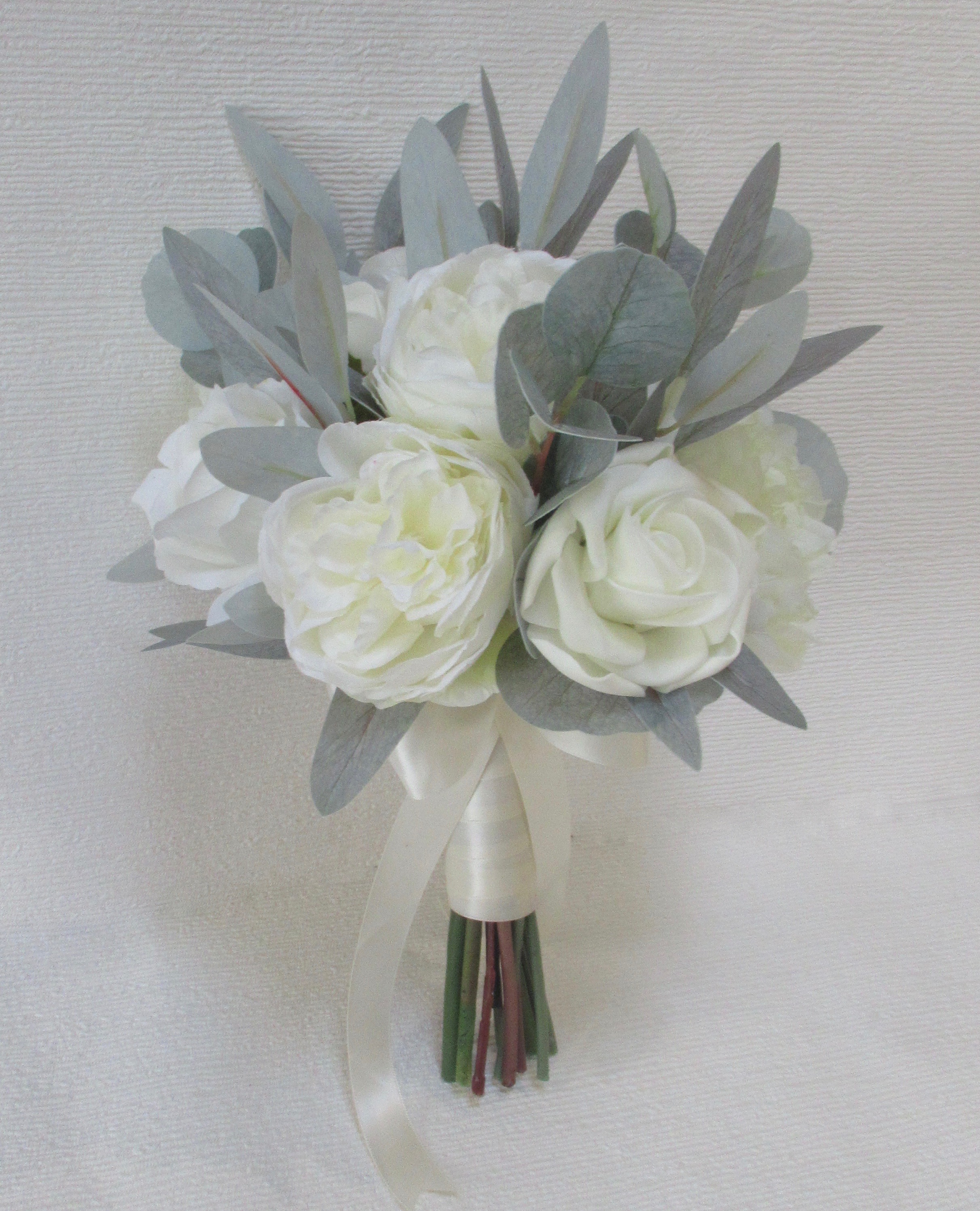Ivory peonies & roses with light sage green/grey real touch long leaf eucalyptus and round leaf eucalyptus foliage - handle/stems wrapped in ivory ribbon with bow & streamers