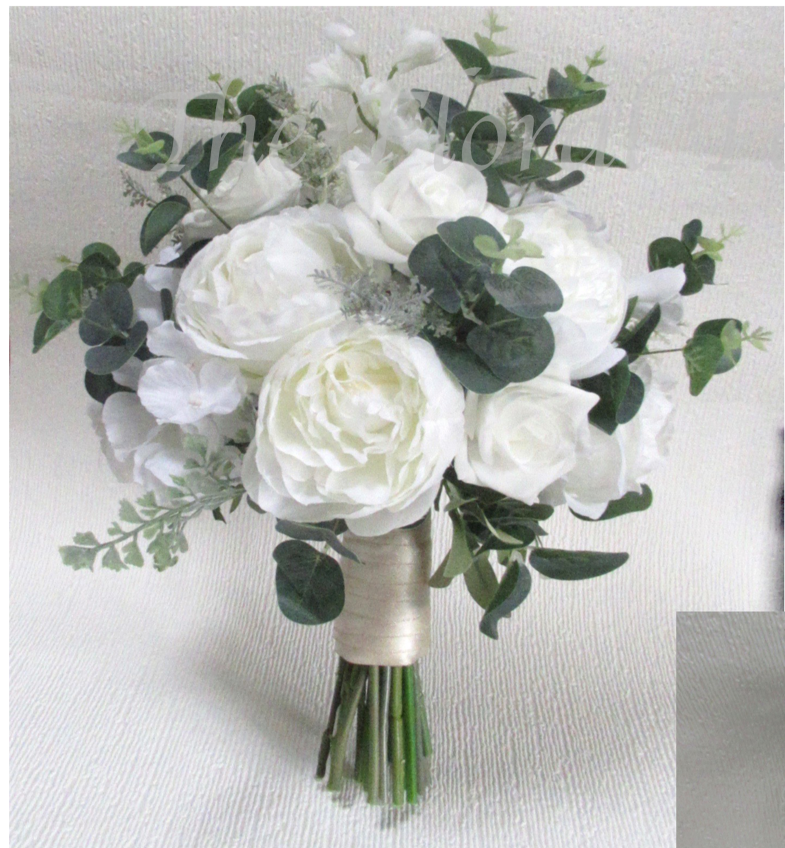Winter white peonies & white roses with light sage green/grey real touch long leaf eucalyptus and round leaf sage/greyeucalyptus foliage - handle/stems wrapped in off white ribbon with streamers