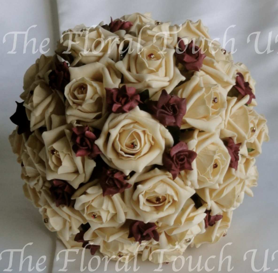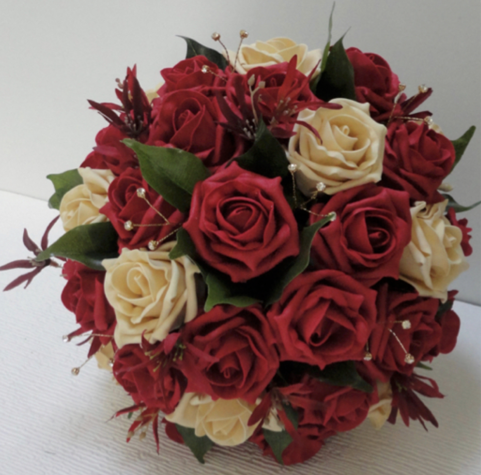 High quality lifelike polyfoam roses in ruby and champagne gold with deep red tweedia sprays, real touch fiscus leaf foliage and gold diamante sprays - stems wrapped in deep red taffeta with a taffeta and organza bow (or your own choice of colour) & finished with a beautiful gold diamante brooch.