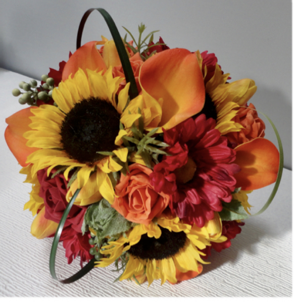 Lifelike natural rustic styled bridal bouquet of golden sunflowers, flame real touch tulips, ruby red & orange lifelike polyfoam roses, real touch orange calla liies and deep red gerbera with berries, grass loops and flocked foliage.