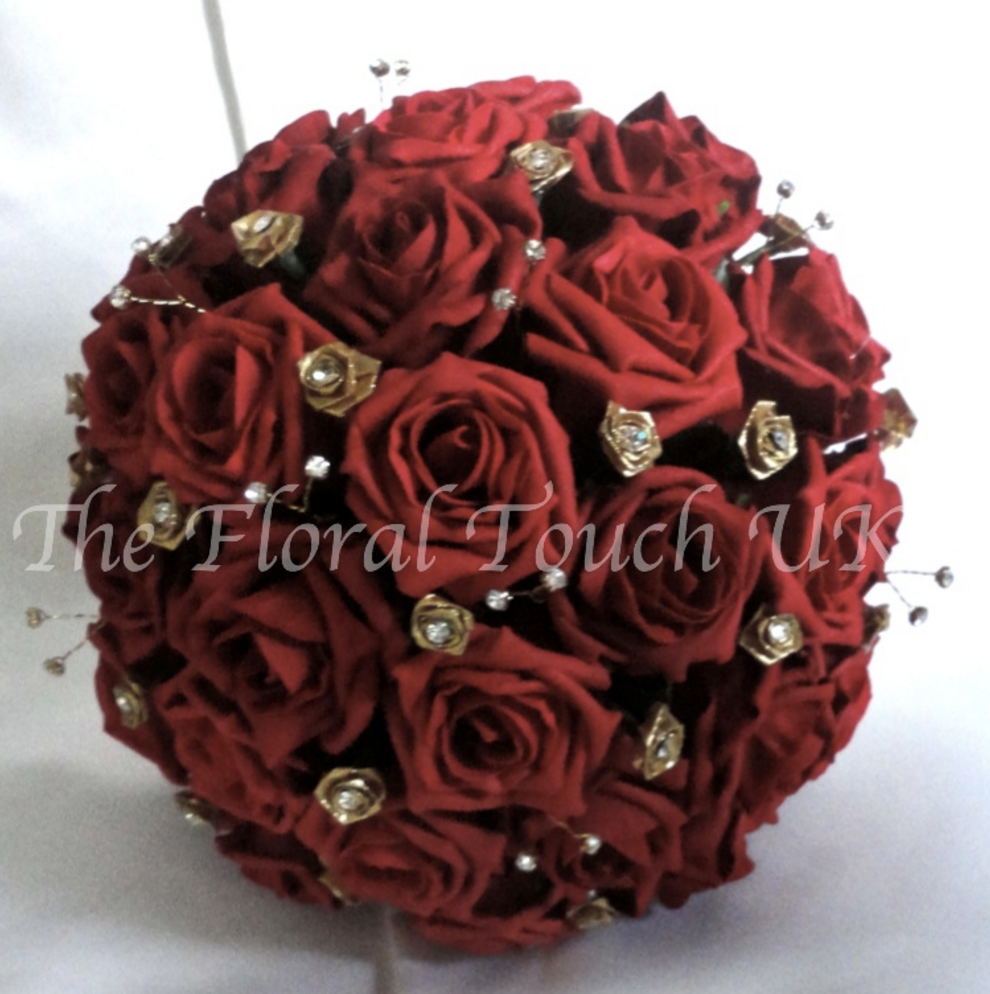 Lifelike polyfoam roses & buds with ruby diamante to centre of each gold rose - Gold organza ruffle to underside (optional) - Stems wrapped in gold satin ribbon with pearl trim.