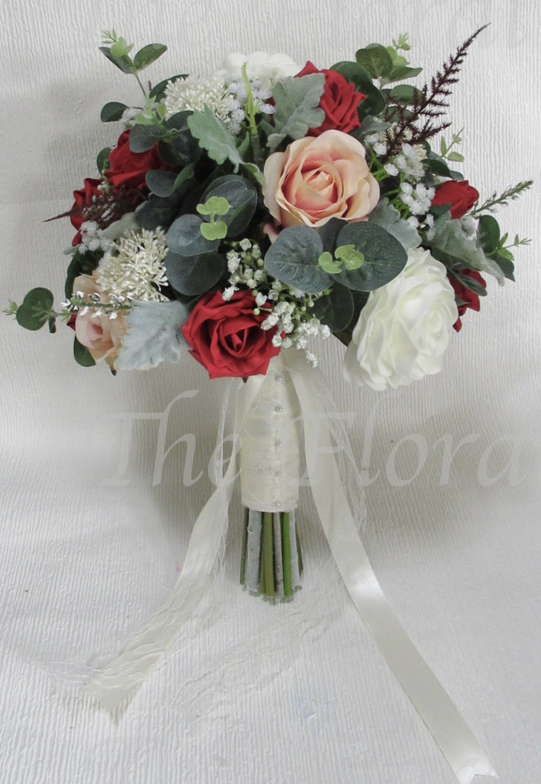 Stunning bouquet consisting of deep red roses, peach roses, ranunculus with ivory trachelium, gyp, dusty miller leaves, burgundy fern leaves, and eucalyptus - handle/stems wrapped in ivory satin with lace overlay and lace a satin streamers
