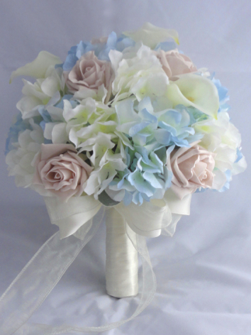 Romantic bouquet of ivory & pale blue hydrangea with blush roses and real touch ivory calla lilies - stems/handle wrapped in ivory satin ribbon with organza & satin Bow and organza ribbon trails.