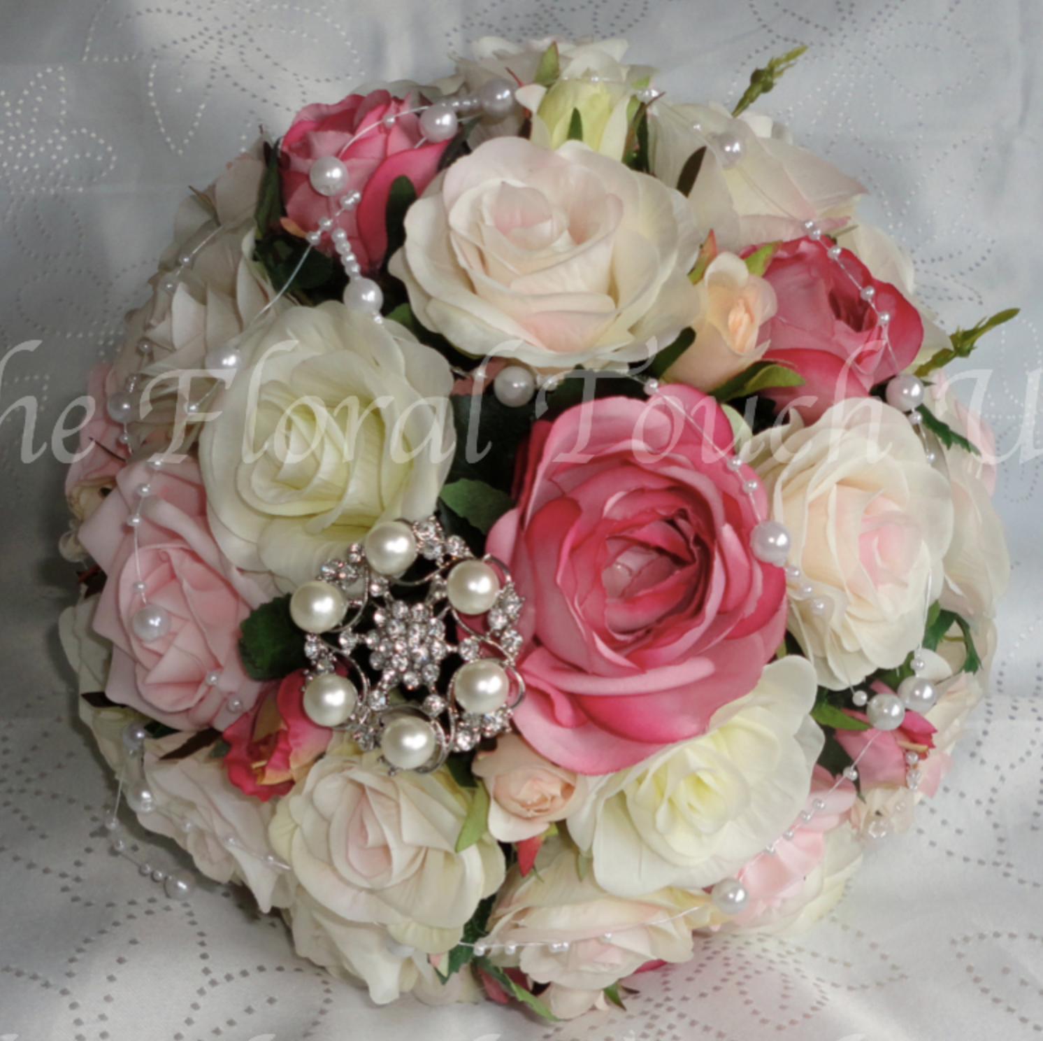 Beautiful fresh touch blush pink and ivory roses with deep pink silk accent roses, pearl string detail and beautiful brooch. Stems wrapped in wide choice of styles.