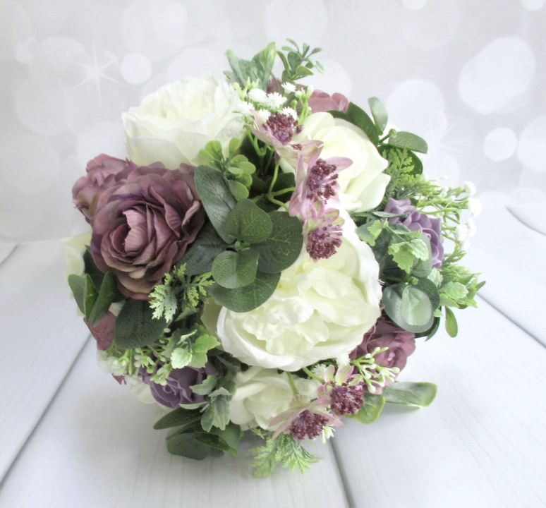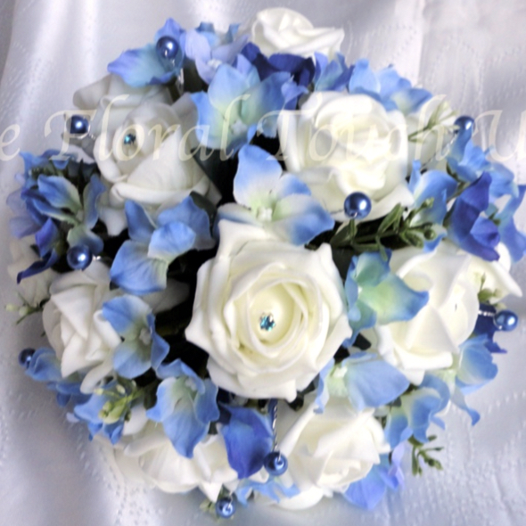 White peonies & roses with burgundy roses, mini blue (or choice of colour) roses, white delphinium and real touch eucalyptus foliage with various filler and white queen anne lace flowers
