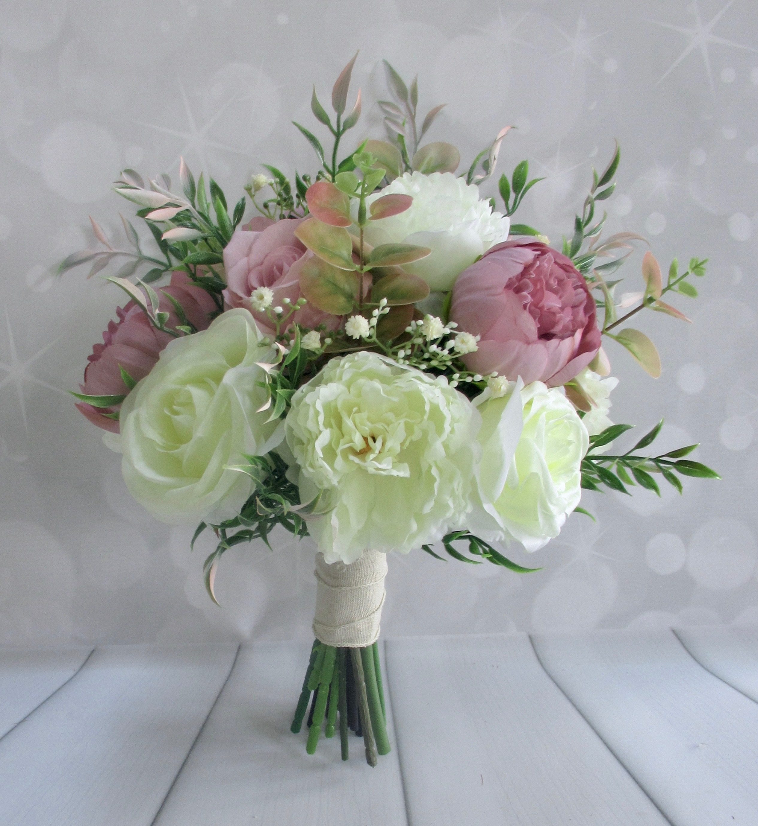 Beautiful dark dusky pink/mauve peonies & roses with ivory roses and frilly peonies with gypsophila, blush tipped foliage and real touch eucalyptus - stems wrapped in natural ivory linen ribbon