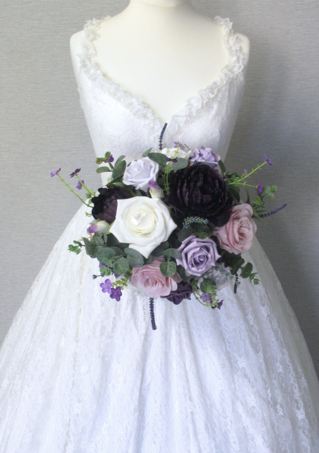 Budget bridal bouquet consisting of aubergine peonies, dusky lilac, purple and lilac roses, ivory roses, purple wild flowers, eucalyptus and mixed foliage - stem wrapped in silver ribbon with lace overlay & pearl detail