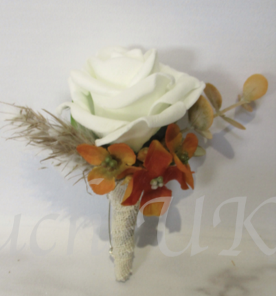 Small ivory rose with, pale orange tipped eucalyptus, burnt orange hydrangea and natural beige pampas grass