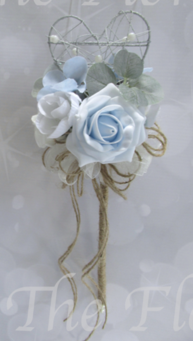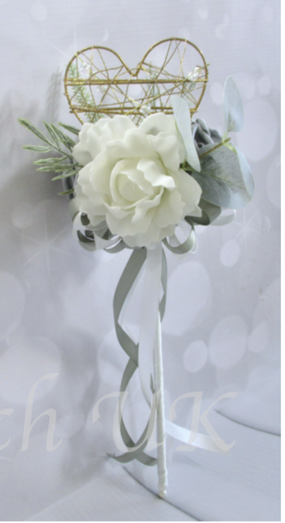 Silver sparkle heart wand with white (or wide choice of colour) polyfoam roses, blossom flower and hydrangea with mini lavender rose , eucalyptus foliage and heather spray - finished with lavender satin & white organza bow & streamers
