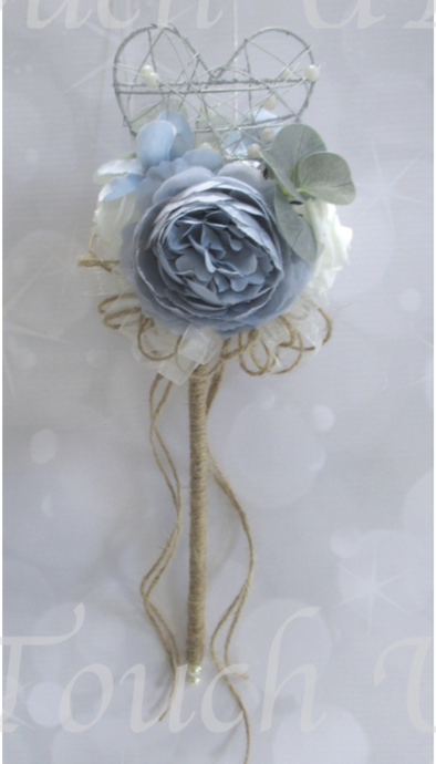 Silver or Gold glitter heart wand with dusky blue mini peony with white roses with dusky blue blossom and real touch sage green eucalyptus - handle wrapped in twine with organza and twine bow with twine streamers