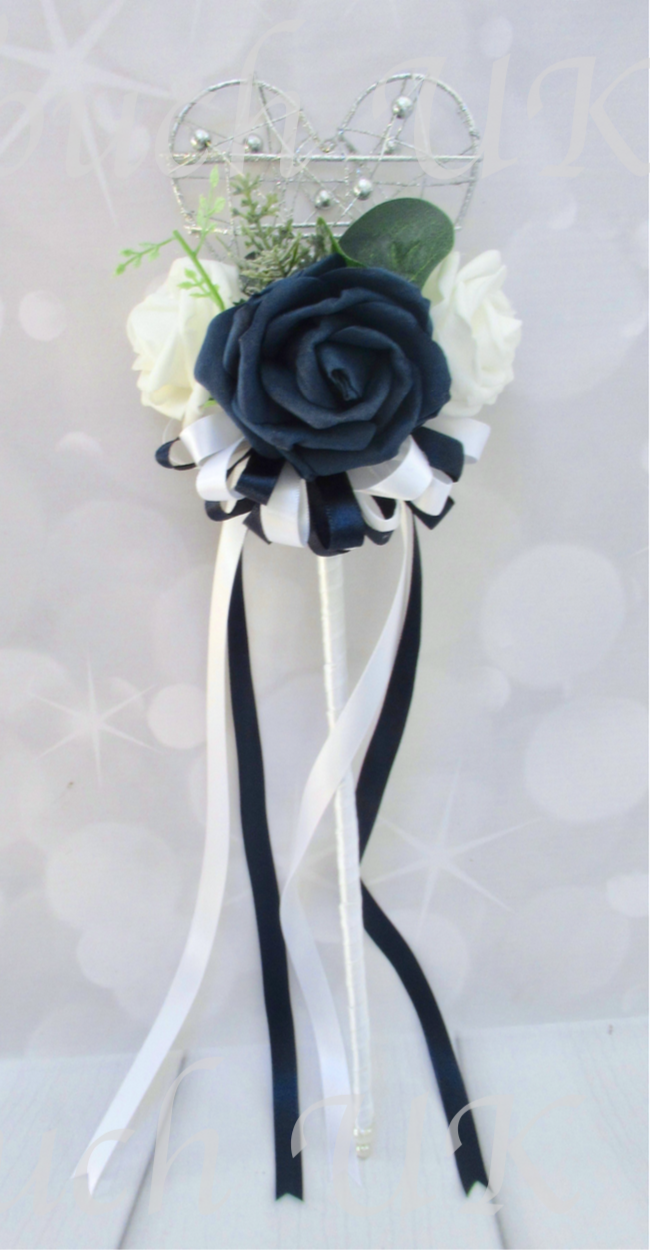 Pretty wand for your little princess's silver glitter heart shaped wand with white & navy polyfoam roses and eucalyptus - finished with white & navy looped bow and white & navy streamers