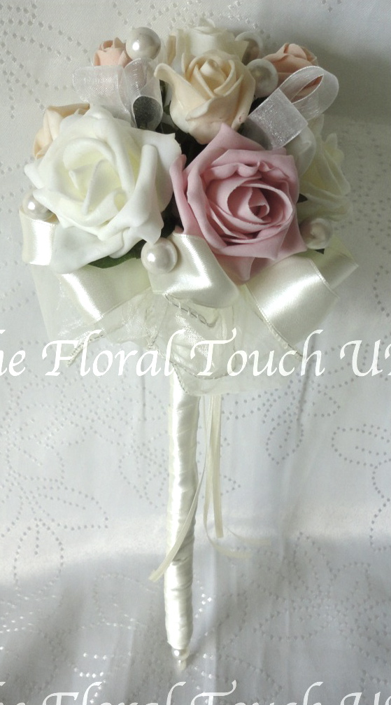 Gorgeous vintage style rose wand of lifelike polyfoam roses in ivory, champagne and dusky pink with pearls and organza loops, organza and satin bow to underside with ivory streamers - Handle wrapped in satin ribbon.