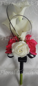 Real Touch Calla Lilies, silk and polyfoam roses with diamantes to centres with black beargrass loops - black satin ribbon loops to underside.