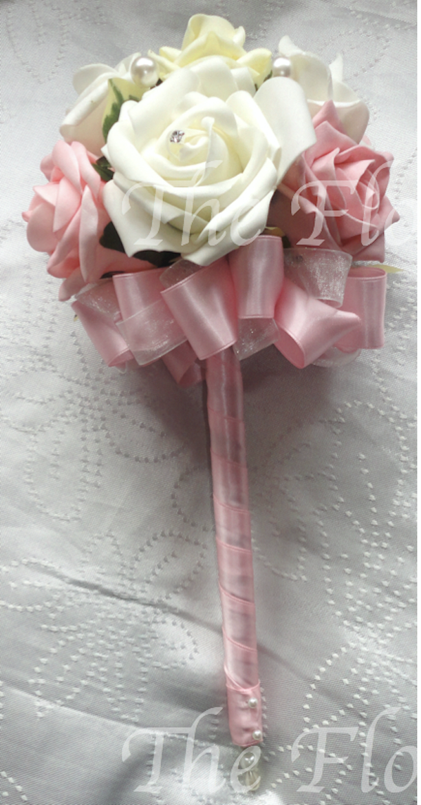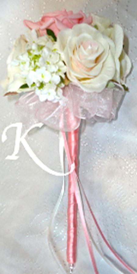 Stunning flower girl wand of vintage pink/ivory roses with pink polyfoam rose and ivory snowball - organza loop detail and handle wrapped in pik satin ribbon with pink & ivory streamers.