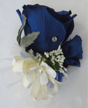 Navy Blue & Ivory Freesia & Rose Bud Corsage with Lily of The Valley &Crystal Sprays