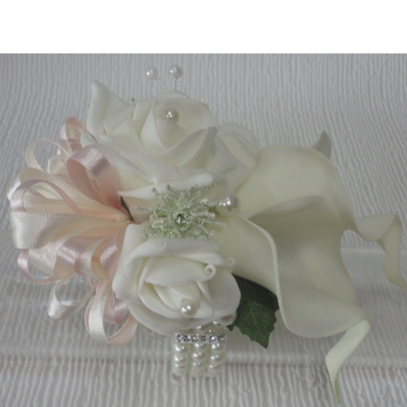 Real touch ivory calla lilies with roses and pearls - set on a pearl bracelet with diamante embellishments