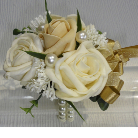 Ivory rose bud with champagne gold mini roses and gold diamante ribbon roses, ivory pearl sprays and gold bead sprays - gold edged ivory ribbon and set on a 2 row gold diamante bracelet