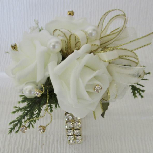Diamante ribbon roses with ivory roses and seed pearl sprays - bracelet to be replaced with 4 row silver diamante bracelet as plum no longer available