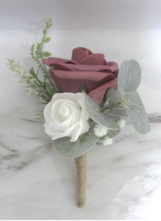 Dusty rose & white buttonhole with sage green real touch eucalyptus, gyp, heather & fern - stem wrapped in twine