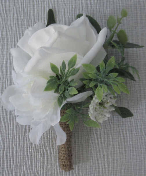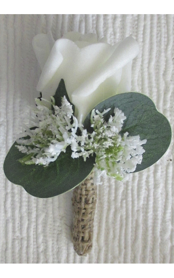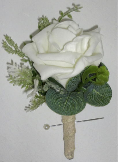 White lifelike polyfoam rose with mixed sage foliage and backed with real touch eucayptus leaves - stem wrapped in natural linen or own choice