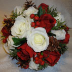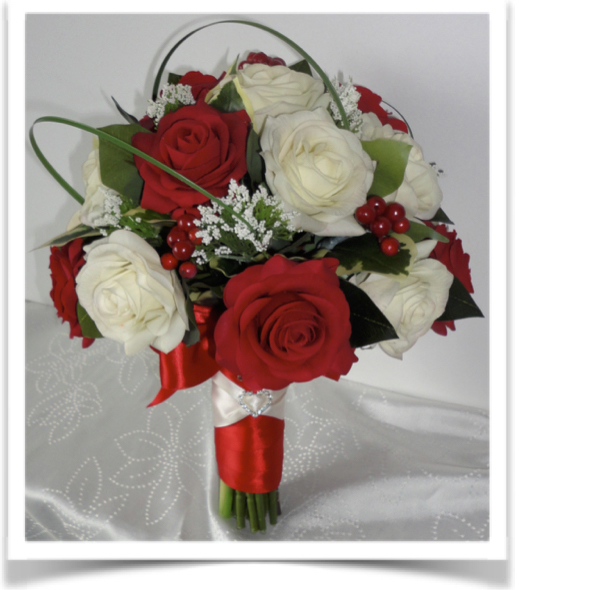 Red & Ivory beautiful silk roses with berries & pine cones (these can be glitter iced if preferred) with flocked foliage and ivy leaves - Stems wrapped in ivory satin wrap with pearl detail & bow with diamante heart to finish.