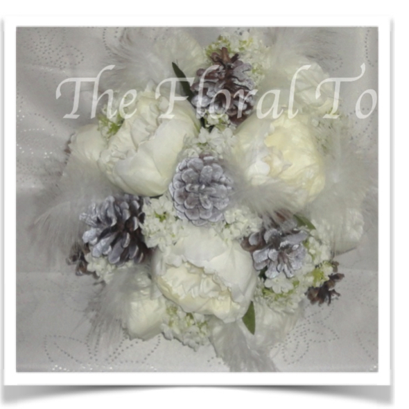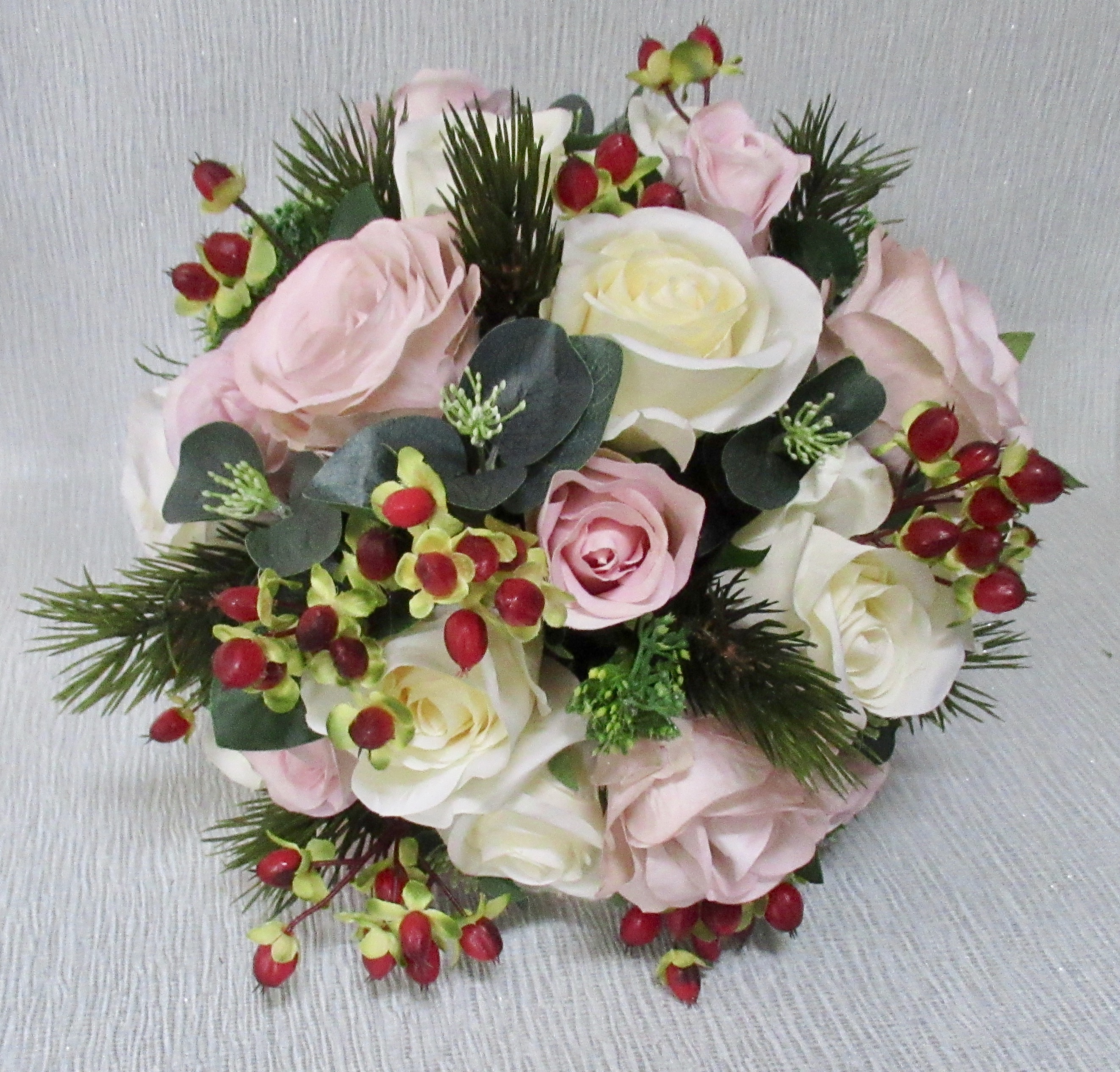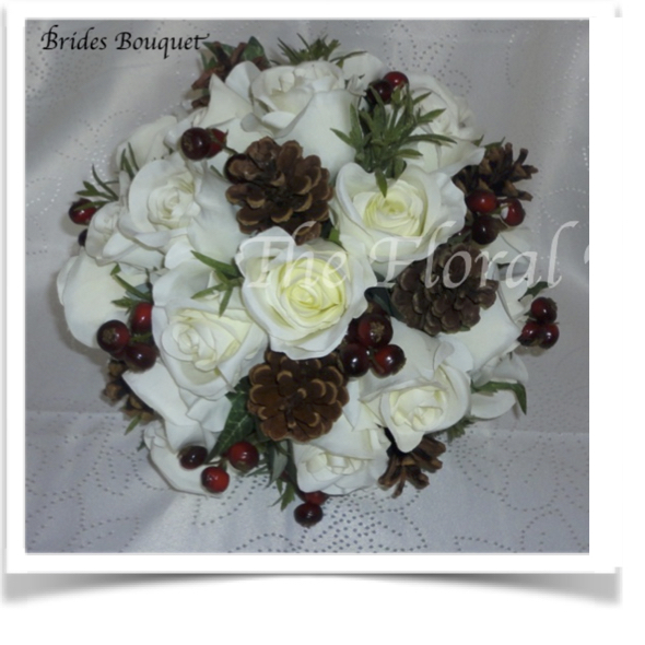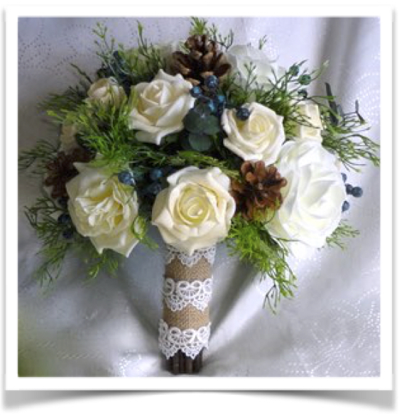 Beautiful Ivory silk roses with berries & pine cones (these can be glitter iced if preferred) with flocked foliage - Stems wrapped in ivory satin wrap with pearl detail & bow with diamante heart to finish.