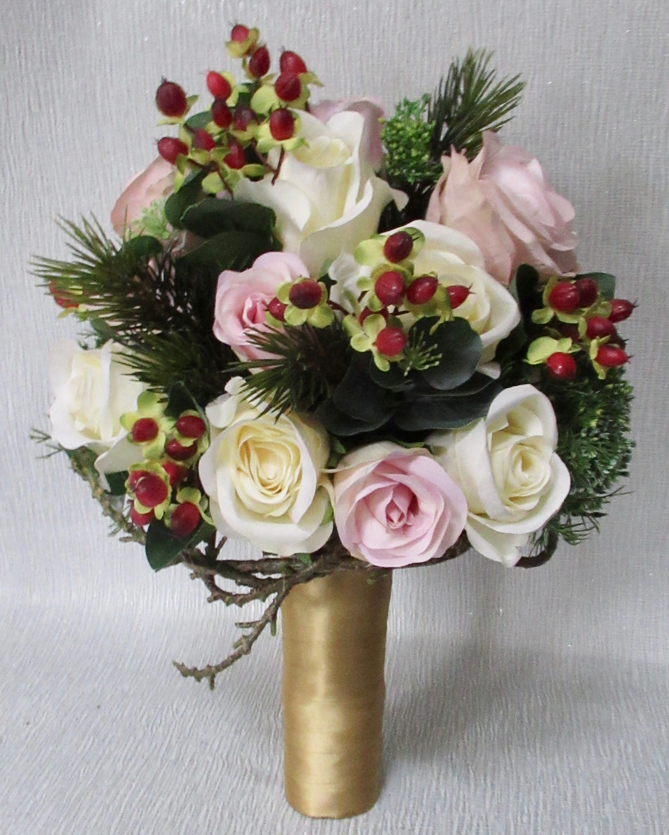BLUSH, PINK & IVORY BRIDAL FLOWERS - Gorgeous lifelike bridal bouquet of blush and pink silk roses large & small, ivory silk eternity roses and red hypericum berries with pine foliage, seeded eucalyptus foliage and trachelium - twig collar to base of bouquet and handle fully wrapped in choice of colour satin ribbon, twine, hessian or lace.