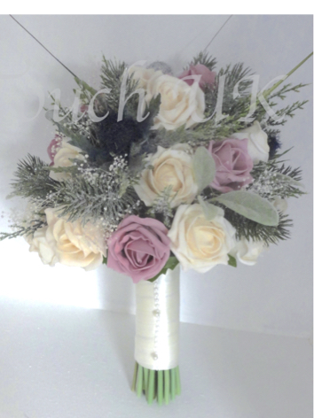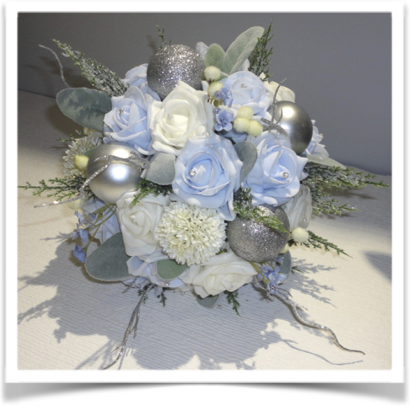Wow...stunning winter wonderland bridal bouquet - pale ivory/winter white & ice blue lifelike polyfoam roses with pearls & diamantes to centres, pale blue gypsophila, ivory alliums & snow berries with beautiful soft flocked lambs ear leaves and iced cypress fern foliage - silver & glitter baubles with silver glitter twig sprays - stems wrapped in ice blue or ivory satin ribbon with silver sash with pearl & diamante brooch (or own choice) with bow.