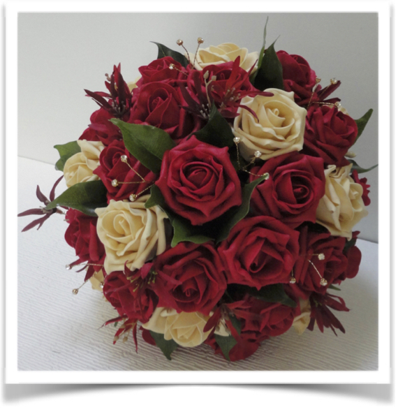 High quality lifelike polyfoam roses in ruby and champagne gold with deep red tweedia sprays, real touch fiscus leaf foliage and gold diamante sprays - stems wrapped in deep red taffeta with a taffeta and organza bow (or your own choice of colour) & finished with a beautiful gold diamante brooch.