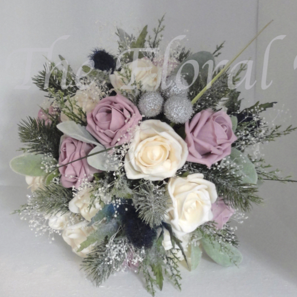 Dusky Pink & Cream Bridal Bouquet - A beautiful lifelike wedding bouquet of dusky pink & cream lifelike polyfoam roses with blue eryngium thistles, silver brunia berries, flocked silvery sage lambs ear leaves, iced fir & pine foliage with real life freeze dried gypsophila - stems/handle wrapped in ivory satin with diamante & pearl trim.