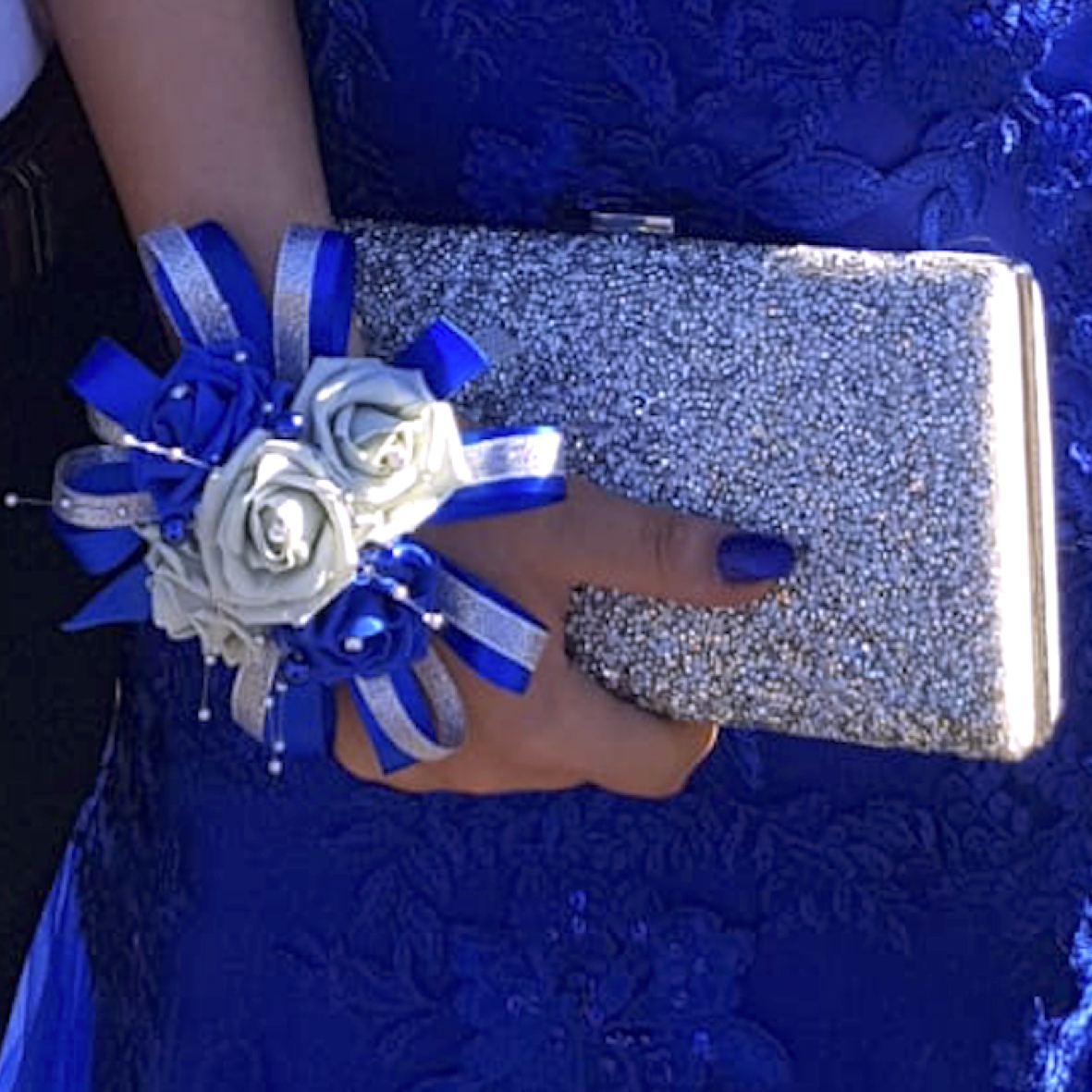 Navy Blue & Silver Wrist Corsage with Heart Gem Spray Detail