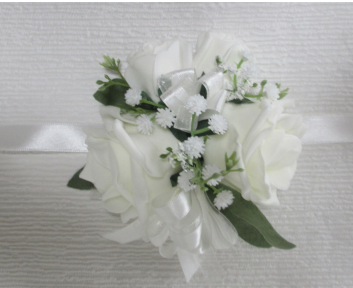 White roses & buds with gypsophila and real touch fiscus leaves with satin & organza corsage bow - ribbon tied
